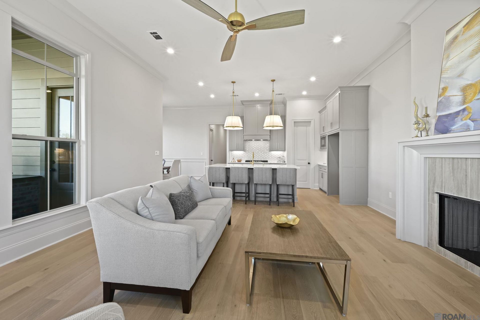 **AGENT OPEN HOUSE THIS WEDNESDAY 11 AM - 1 PM** Brand-new construction in one of Ascension Parish's newest and most desirable communities! This thoughtfully designed home offers upscale finishes, functional spaces, and modern comfort just minutes from shopping, dining, and top-rated Ascension Parish Schools. Beautiful wood flooring flows throughout the main living areas and all bedrooms, creating warmth and continuity. The living room features a sleek fireplace and convenient floor outlet for flexible furniture placement. The kitchen is both stylish and functional with quartz countertops, a 36-inch gas cooktop, custom vent hood, soft-close cabinetry, and a large island with storage on both sides. The dining area is accented with a designer feature wall for added character. Additional interior highlights include a powder bath with decorative detailing, spacious laundry room with folding counter and storage, linen closet, and a custom mudroom with built-in cubbies. Gold-accented hardware, plumbing fixtures, lighting, and framed mirrors provide a cohesive, elevated finish throughout. The private primary suite offers a spa-like bath with a 6-foot soaking tub, custom-tiled shower with niche, frameless glass enclosure, and separate water closet. Enjoy outdoor living on the covered patio featuring a coffered ceiling, recessed lighting, ceiling fan, louvered shutters, brick privacy wall, and outdoor kitchen, perfect for entertaining year-round. The oversized garage includes 10-foot ceilings plus a dedicated golf cart bay with its own overhead door. Community amenities include a resort-style pool, pool house, fitness center, scenic green spaces, and a pond. Experience low-maintenance living in a beautifully planned neighborhood designed for both relaxation and connection.